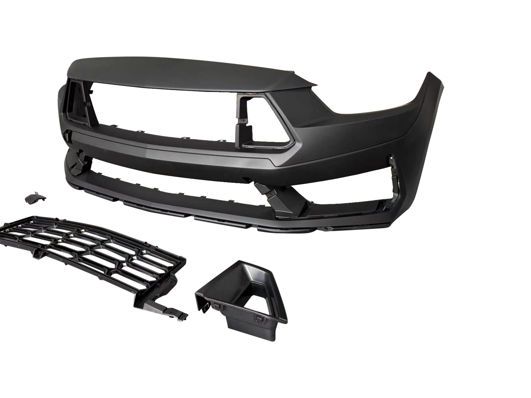 Transform your 2015-2017 Mustang S550 with the S650 Dark Horse Conversion Bumper Kit. Inspired by the 2024 Dark Horse, this kit features an aggressive design with sharp lines, larger air intakes for improved cooling, and a race-inspired lower splitter. Made from durable ABS plastic and polypropylene, it offers lightweight resilience against minor impacts while maintaining a sleek, modern look.