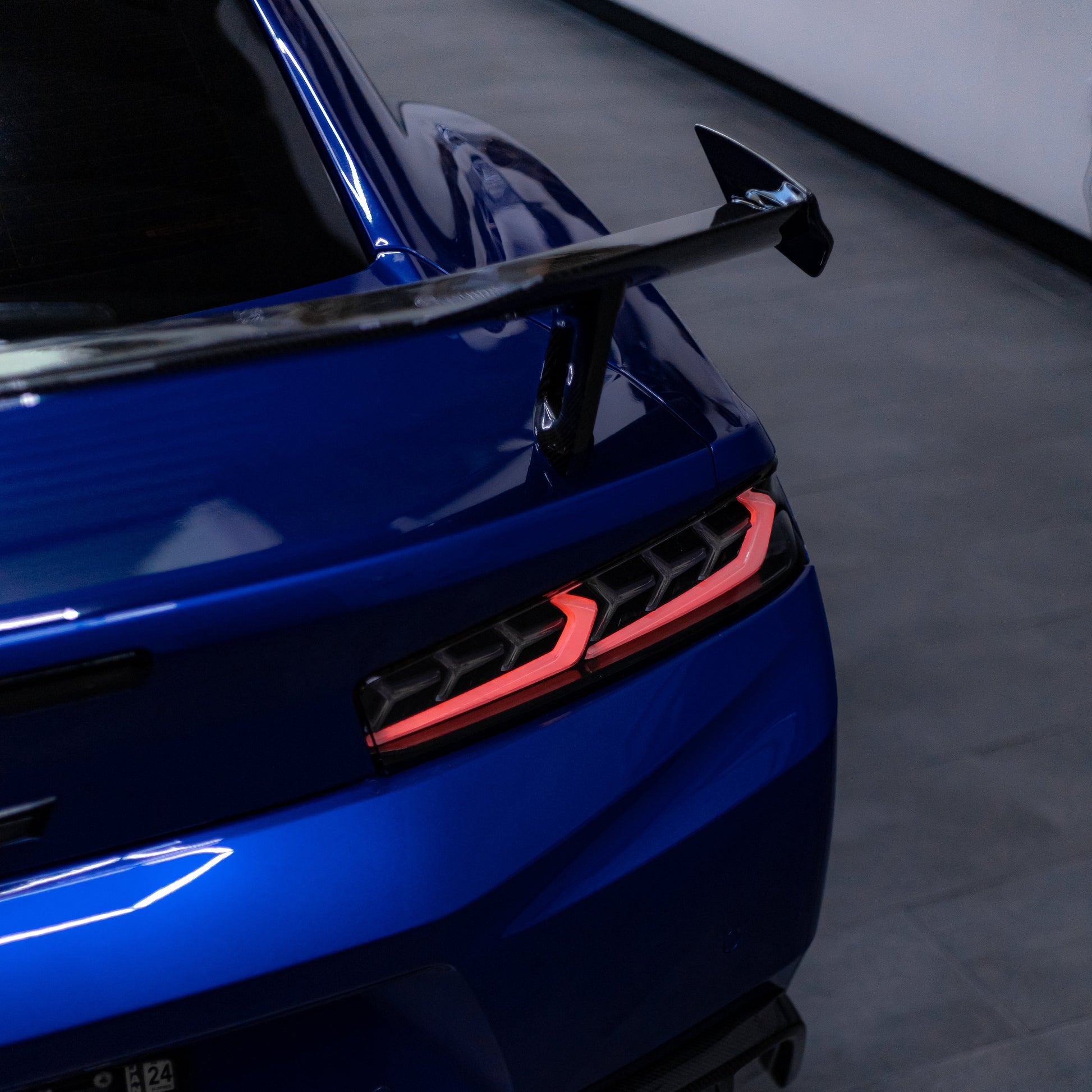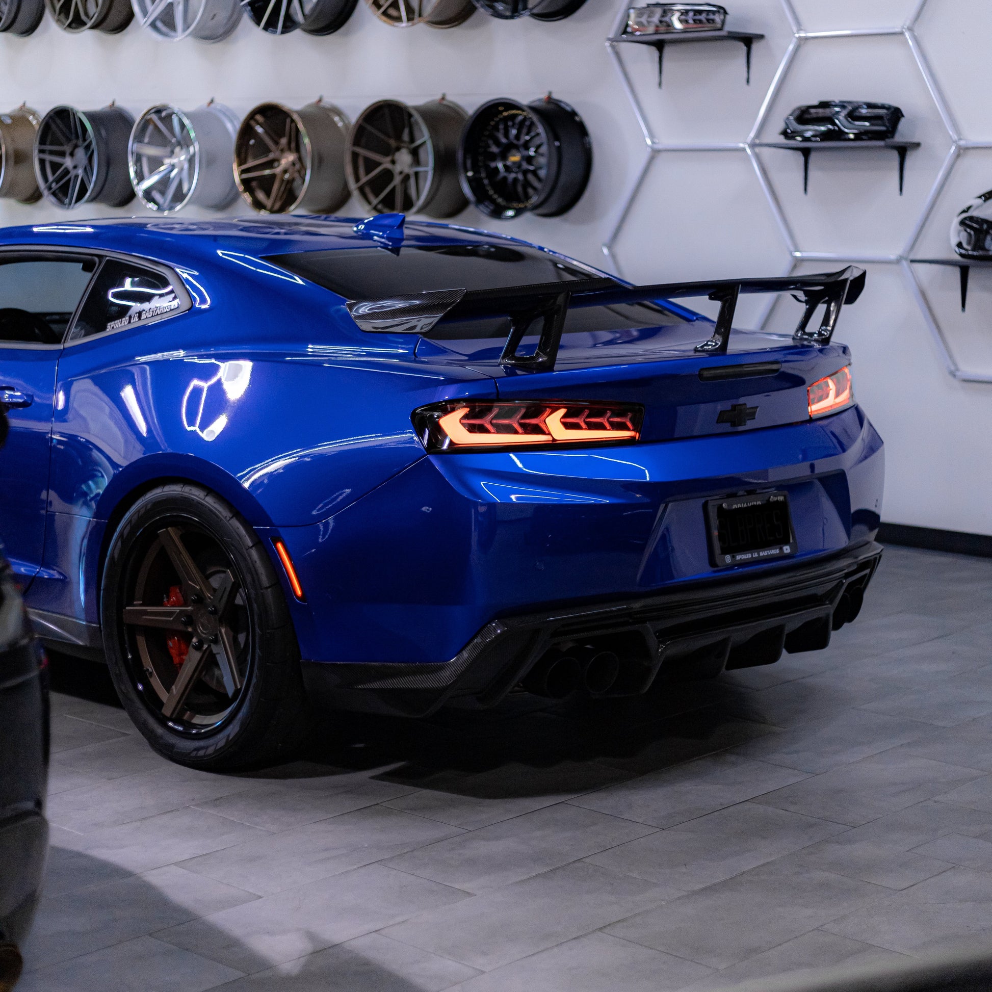 Draw the eye with ultra-bright LED taillights that celebrate speed. This plug-and-play kit is pre-assembled and easy to install in your 2016-2018 Chevrolet Camaro LT, RS, SS, SS 1LE, ZL1, or ZL1 1LE. These daytime running lights sweep toward the outer edge of the glossy black housing with a modern sense of motion. Crisp white reverse lights and sequential Amber signals shine bright to turn heads.