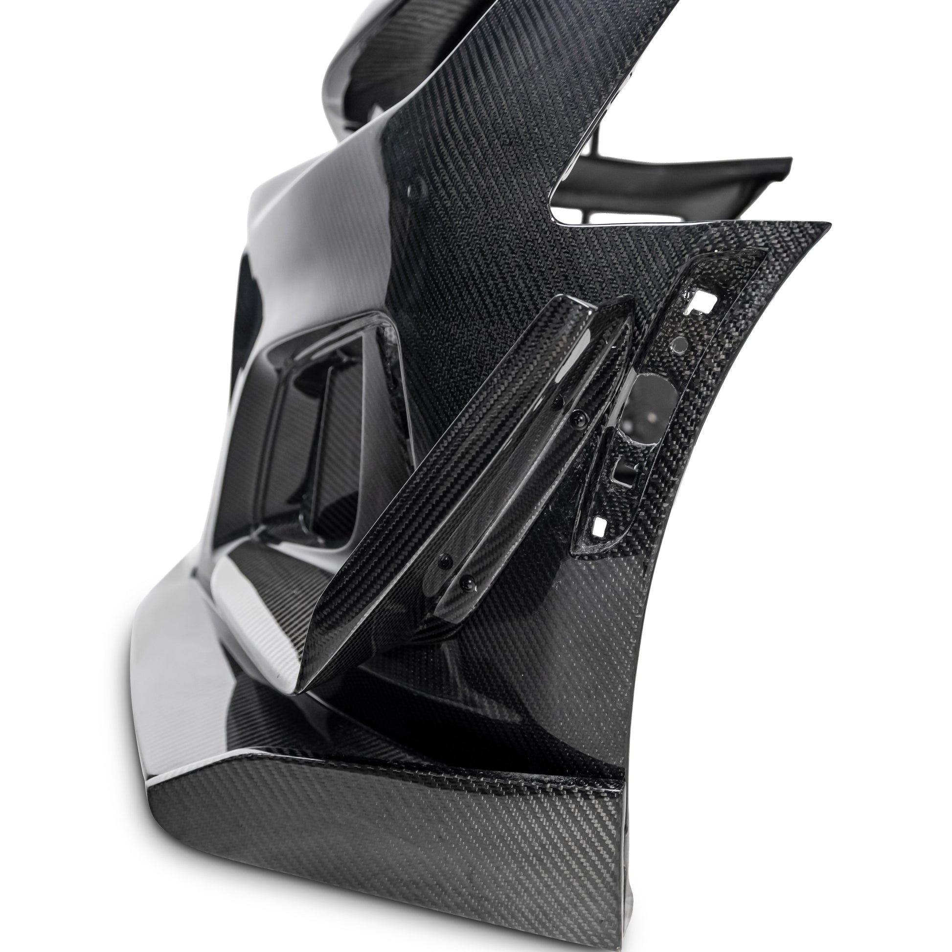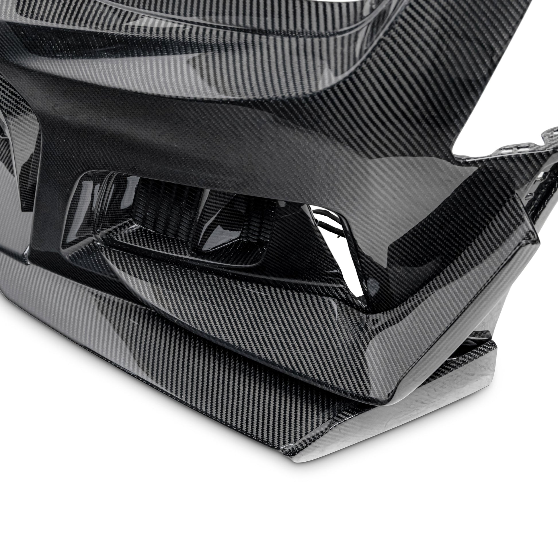 High-Performance Construction. Constructed from premium carbon fiber weaves, this one-piece bumper offers exceptional strength and durability, yet is lightweight to maximize speed and handling. The high-gloss automotive grade clear coat contains proprietary UV-resistant properties to preserve its deep, striking look. Crafted to improve aerodynamics, this bumper minimizes drag and enhances downforce, giving you the edge on the road and track.